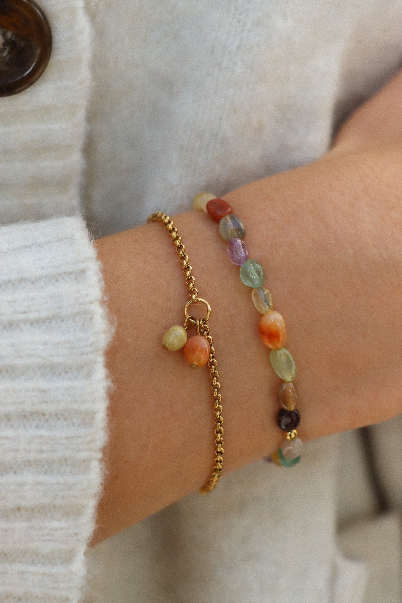 Das Double Boho Elia Bracelet vereint zeitlose Eleganz mit kreativem Boho-Charme. Die verstellbare Elia Armkette mit feinem Kreisdetail wird mit zwei Boho Stone Charms deiner Wahl geliefert – so gestaltest du dein Armband ganz individuell. Jeder Charm besteht aus einem echten, wasserfesten Edelstein und macht dein Schmuckstück zu einem einzigartigen Unikat. Jetzt mit 15 % Set-Vorteil!