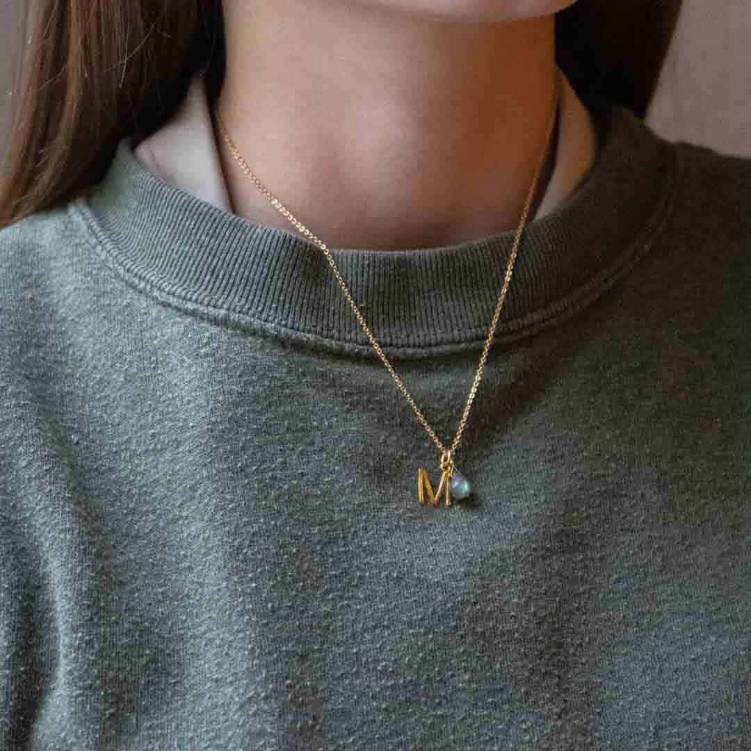 Personalized Moon Love Letter Necklace - Buchstabenkette (wasserfest) - Rosenquarz