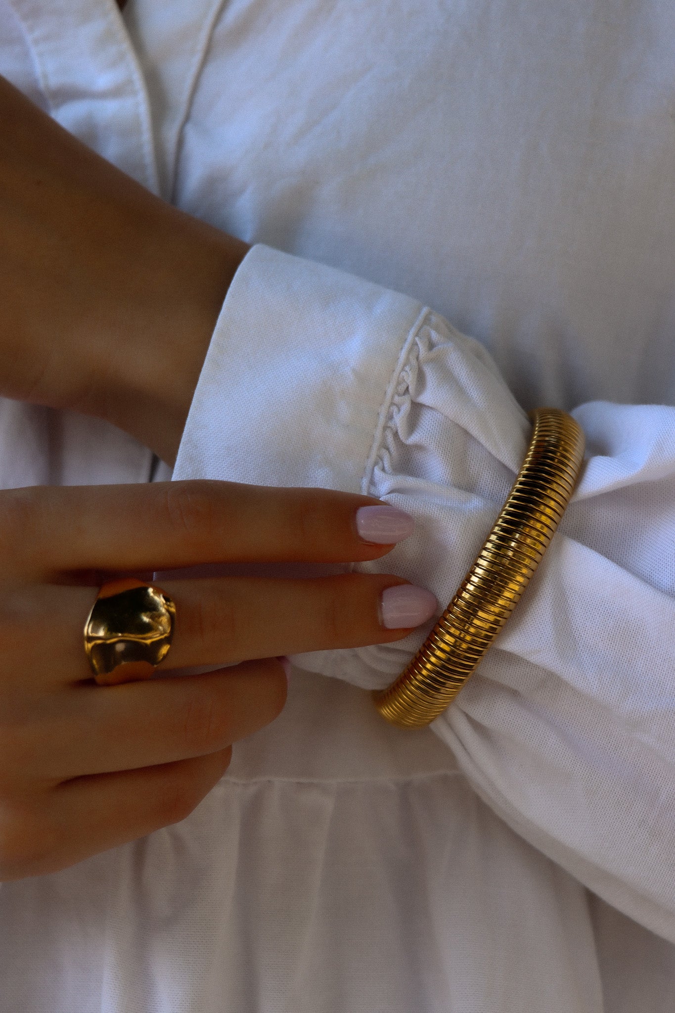 Unser goldener Tilda Bangle schmiegt sich dank seiner Elastizität perfekt an jedes Handgelenk und ist ein wahrer Blickfang. Er ist besonders bequem zu tragen, während die edle goldene Farbe jedem Outfit das gewisse Etwas verleiht. Die hochwertige Verarbeitung und das zeitlose Design machen diesen Armreif zu einem unverzichtbaren Accessoire in deiner Schmuckkollektion. Egal, ob im Alltag oder zu besonderen Anlässen, der Tilda Bangle setzt stets elegante Akzente und unterstreicht deinen individuellen Stil.