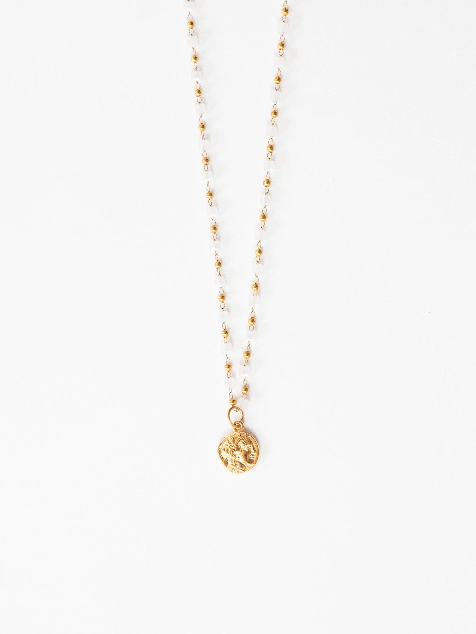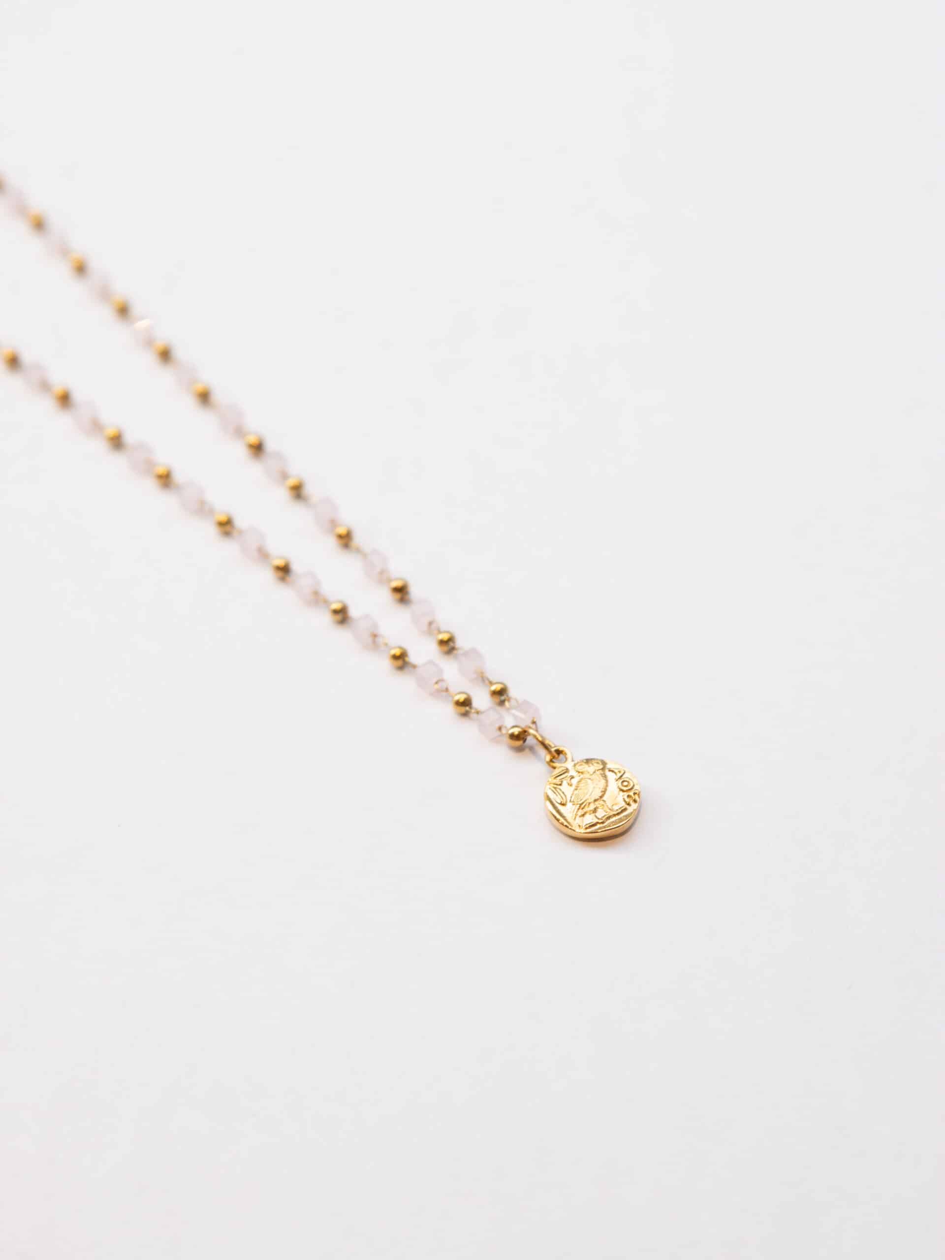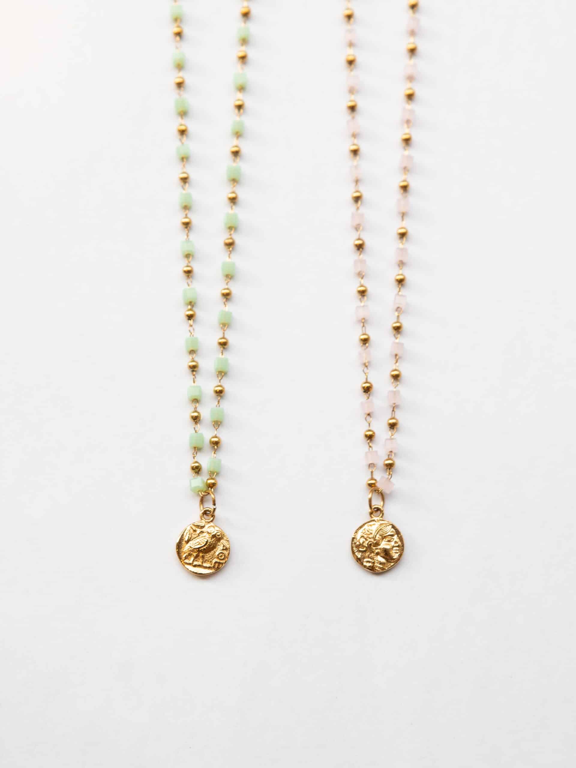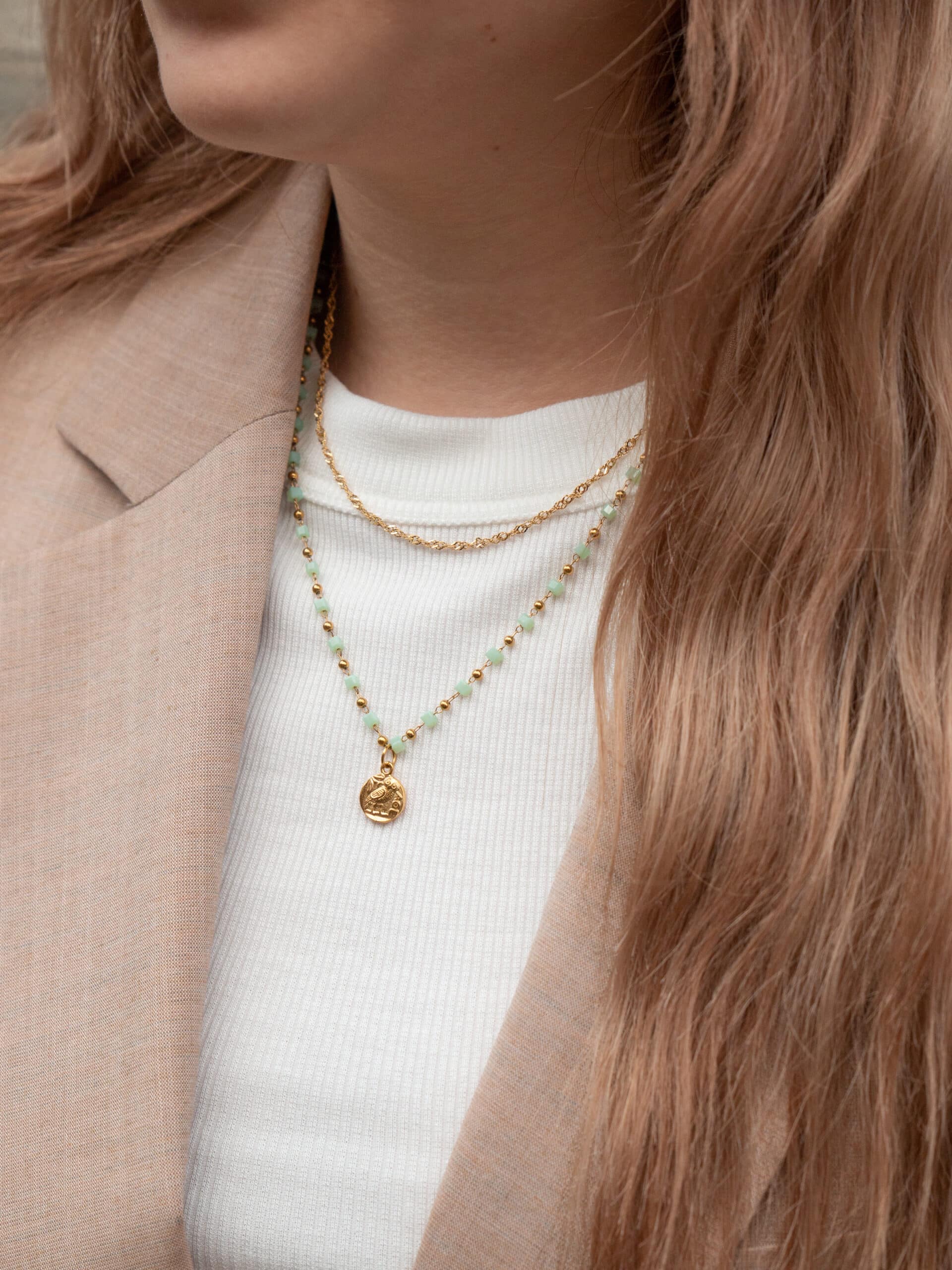Der Anhänger der Alyssa Necklace unterstreicht deine Weisheit und du kannst ihn auf beiden Seiten tragen. Auf der einen Seite strahlst du Weisheit und Strategie mit dem Athene-Symbol aus, drehst du die Kette aber um, sieht man das Owl-Symbol, welches ebenfalls für Weisheit aber auch für Intuition steht. Zudem machen kubische Steinchen in Pastelltönen die Kette zu einem unverwechselbaren Schmuckstück! Die wasserfeste Halskette eignet sich für jeden Anlass und kann du auch beim Duschen anbehalten.