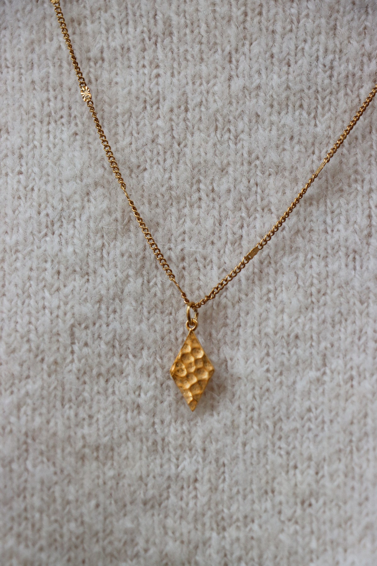 Der Rhombus Anhänger besticht durch sein minimalistisches Design und seine elegante Diamond form, die Mut und Stärke symbolisiert. Das fein gehämmerte Finish verleiht ihm eine moderne, leichte Struktur, die sich mühelos in jedes Outfit einfügt. Ob im Alltag oder zu besonderen Anlässen – mit diesem Anhänger setzt du einen stilvollen Akzent, der immer passt.