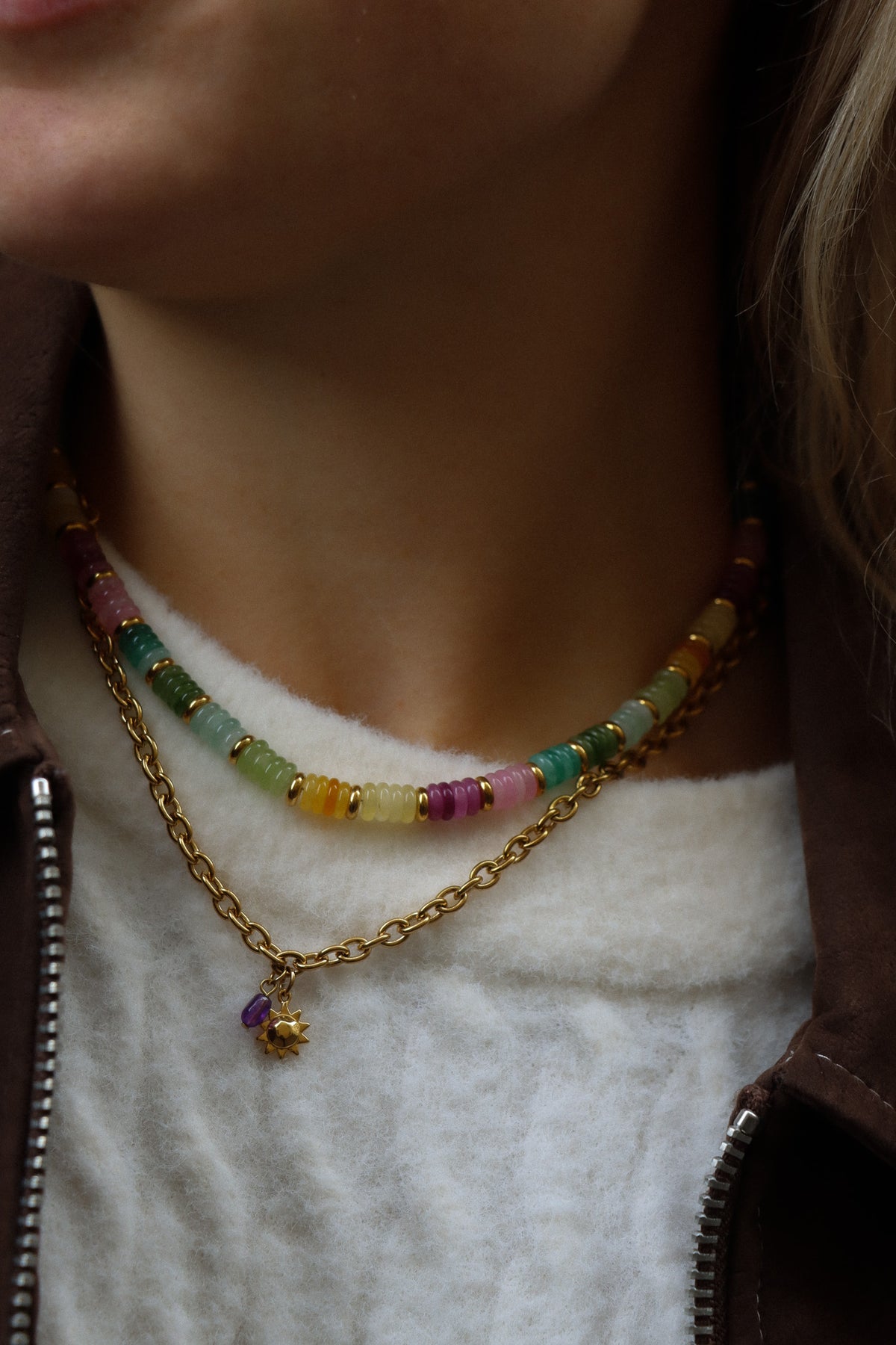 Entdecke die Yula Halskette, ein stilvolles Accessoire, das dein Outfit aufwertet und positive Energie in dein Leben bringt. Jede Kette steht für Glück, Wohlstand und Harmonie, inspiriert von der Kraft edler Steine. Wähle zwischen Yula Rainbow Jade für Ruhe und innere Stärke, Yula Mixed für farbenfrohe Balance und Lebensfreude oder Yula Amazonite für Ruhe und Gelassenheit. Ein zeitloses Schmuckstück, das Schönheit, Bedeutung und Wohlbefinden vereint.