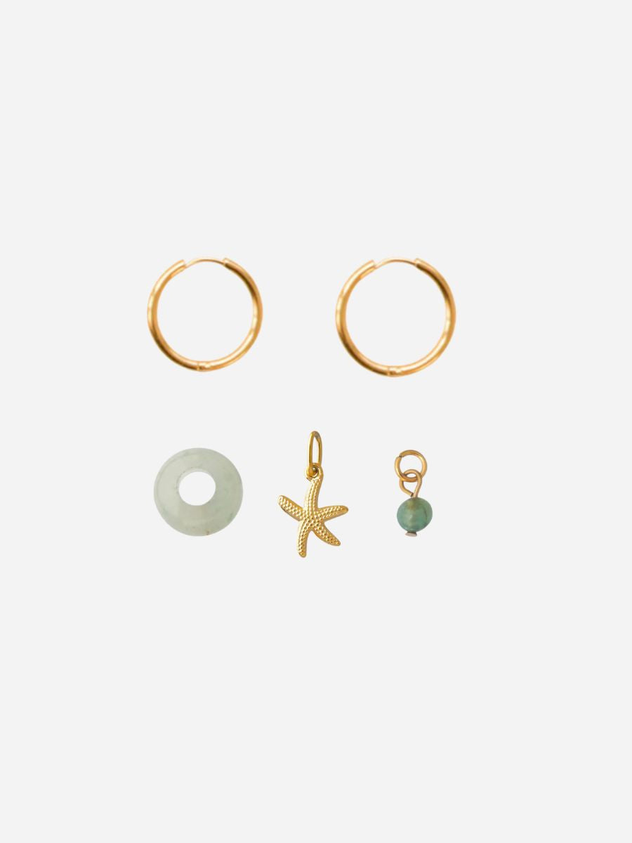 - Set: 1x Ava Infinity Hoop (paar), 1x Mini Stonut (Grüne Jade), 1x Simple Turtle & 1x Boho Stone (Grüner Achat)