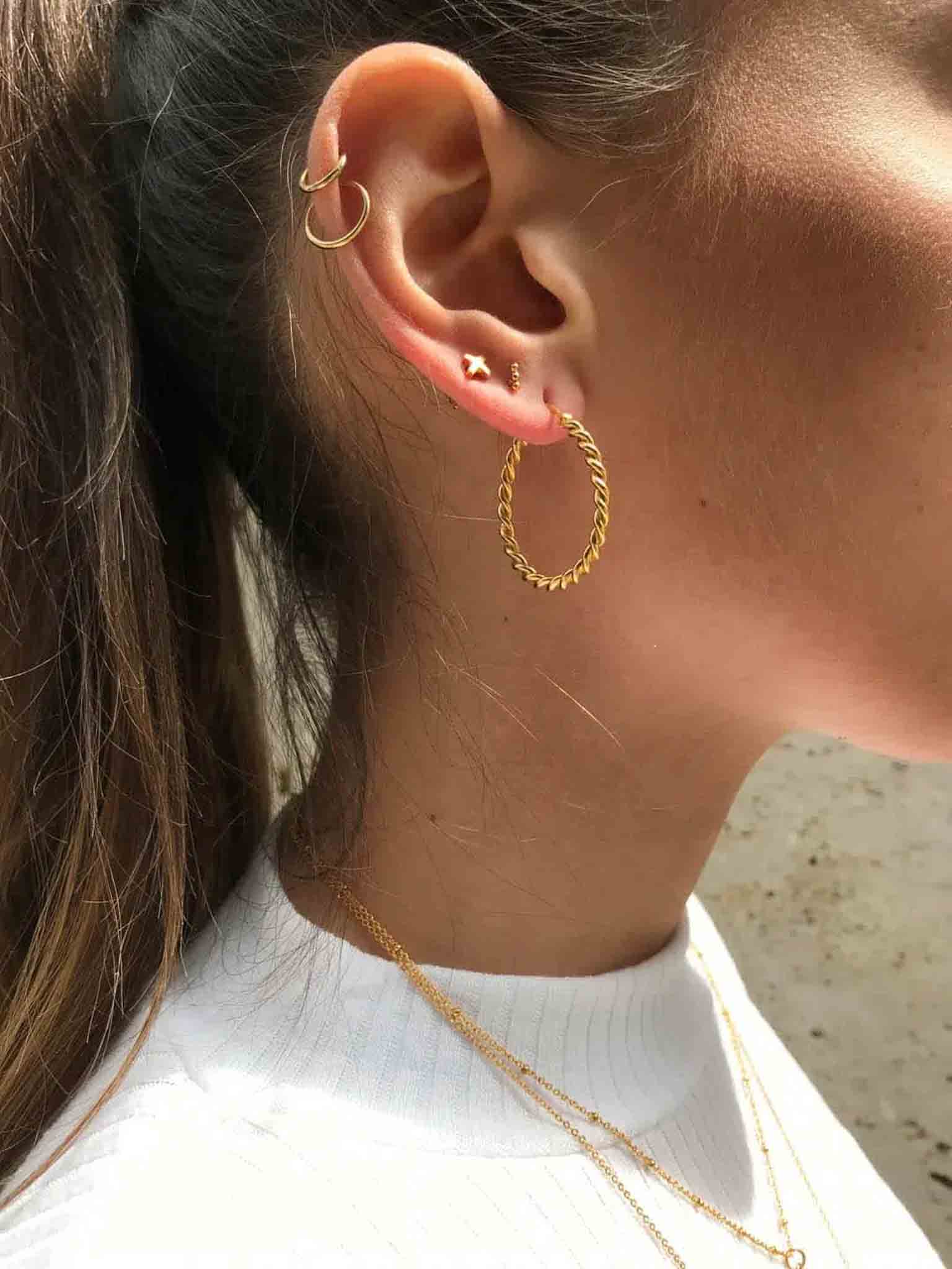 Diese hochwertig vergoldeten Creolen in der Twisted-Optik sind die perfekte Basis für eine ausdrucksstarke Ear Party und verleihen jedem deiner Looks einen femininen Touch.