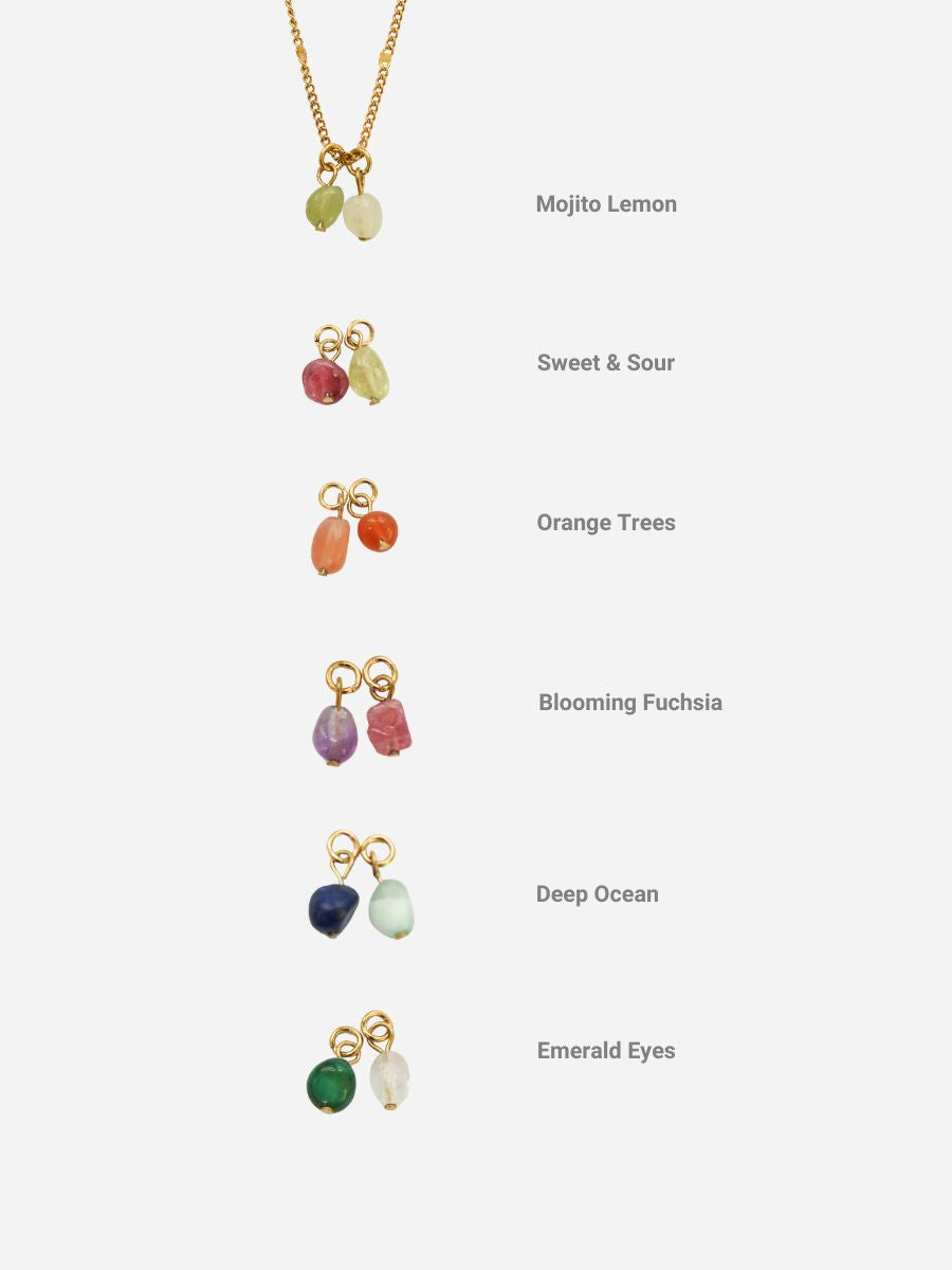 - Anhänger Sets: Mojito Lemon (Grüner Angelit & Gelber Apatit), Sweet & Sour (Roter Turmalin & Gelber Apatit), Orange Trees (Karneol & Sunstone), Blooming Fuchsia (Amethyst & Roter Turmalin), Deep Ocean (Lapislazuli & Angelit), Emerald Eyes (Grüner Achat & Klarer Quarz)