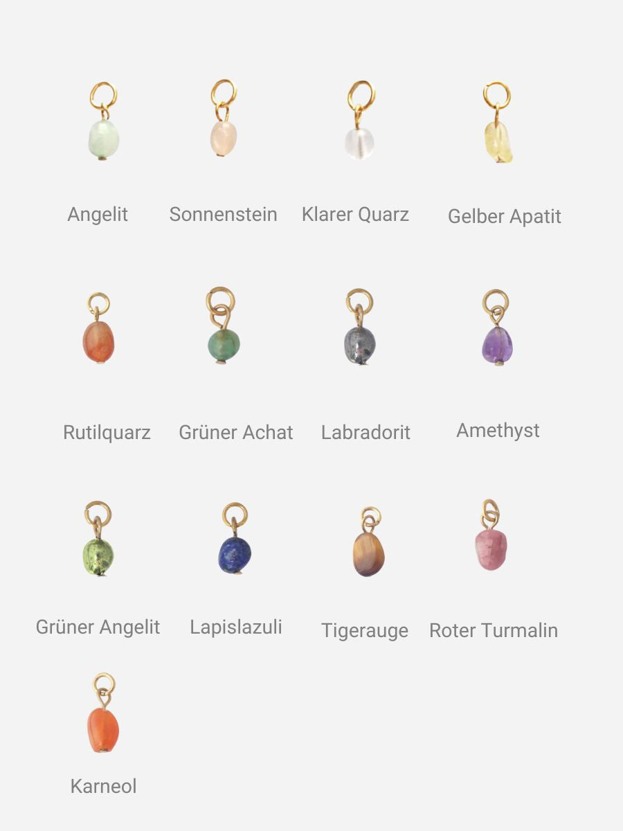 - Steine: Angelit, Gelben Apatit, Sonnenstein, Klaren Quarz, Lapislazuli, Grünen Achat, Labradorit, Amethyst, Grünen Angelit, Rutilquarz, Karneol, Tigerauge und Roten Turmalin