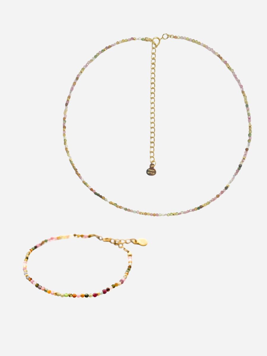 Das Tina Schmuckset bestehend aus Halskette und Armband – ist in zwei wunderschönen Varianten erhältlich: farbenfroh oder in elegantem Grün. Beide Sets kombinieren funkelnde Steine mit goldenen Kügelchen und bringen so jedes Outfit zum Strahlen. Ob im Set getragen oder einzeln kombiniert – Tina ist das ideale Accessoire für moderne Looks mit einem Hauch Farbe.