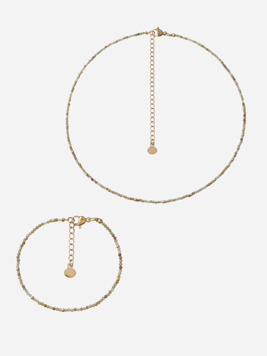 Das Tina Schmuckset bestehend aus Halskette und Armband – ist in zwei wunderschönen Varianten erhältlich: farbenfroh oder in elegantem Grün. Beide Sets kombinieren funkelnde Steine mit goldenen Kügelchen und bringen so jedes Outfit zum Strahlen. Ob im Set getragen oder einzeln kombiniert – Tina ist das ideale Accessoire für moderne Looks mit einem Hauch Farbe. Und das Beste: Beim Kauf des Sets profitierst du von 15 % Preisvorteil gegenüber dem Einzelkauf.