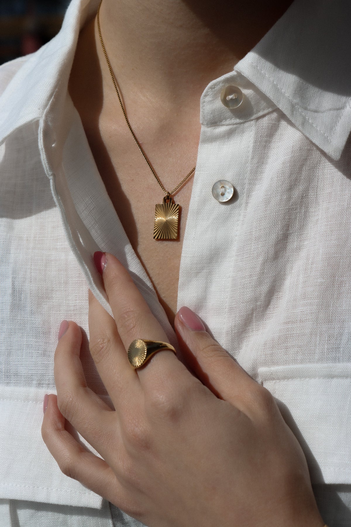 Der Giselle Anhänger ist das perfekte schlichte, aber dennoch atemberaubende Piece, welches diese Saison in keinem Schmuckkästchen fehlen darf. Sie überzeugt durch die raffinierten goldenen Details und lässt dich auf jedem Anlass in neuem Glanz erstrahlen. Ausserdem ist sie wasserfest und auf die Vergoldung hast du 5 Jahre Garantie!