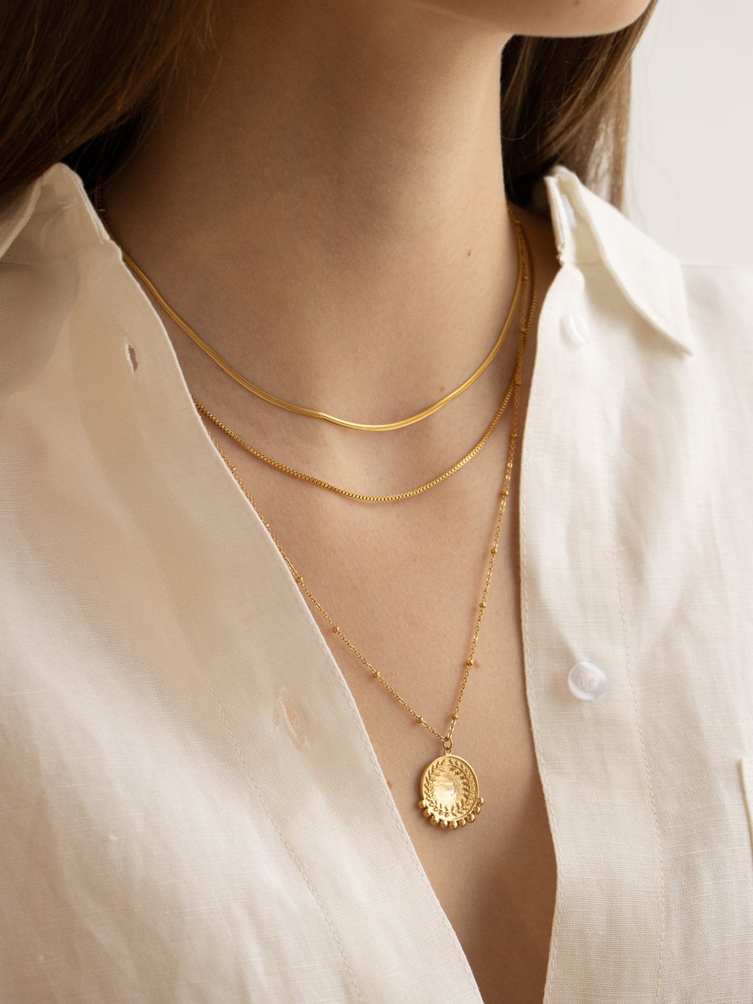 Dieses Amélie Ava Dotted Medaillon Set besteht aus drei einzigartigen Ketten, die eine perfekte Kombination aus indischer Tradition und modernem Stil bieten. Die erste Kette besticht durch ihre elegante Schlangenoptik und ihre feinen, engen Kettenglieder. Die zweite Kette besticht durch ihre einzigartige Optik und verleiht Ihrem Look eine moderne Note. Die dritte Kette ist mit einem wunderschönen Anhänger im indischen Stil versehen. Der kreisförmige Anhänger ist mit kunstvollen Details verziert und kleinen Kügelchen am unteren Rand des Anhängers; sie sorgen für das besondere Extra. Das Halsketten Set ist wasserfest! Auf die Vergoldung der Ketten hast du übrigens 5 Jahre Garantie!