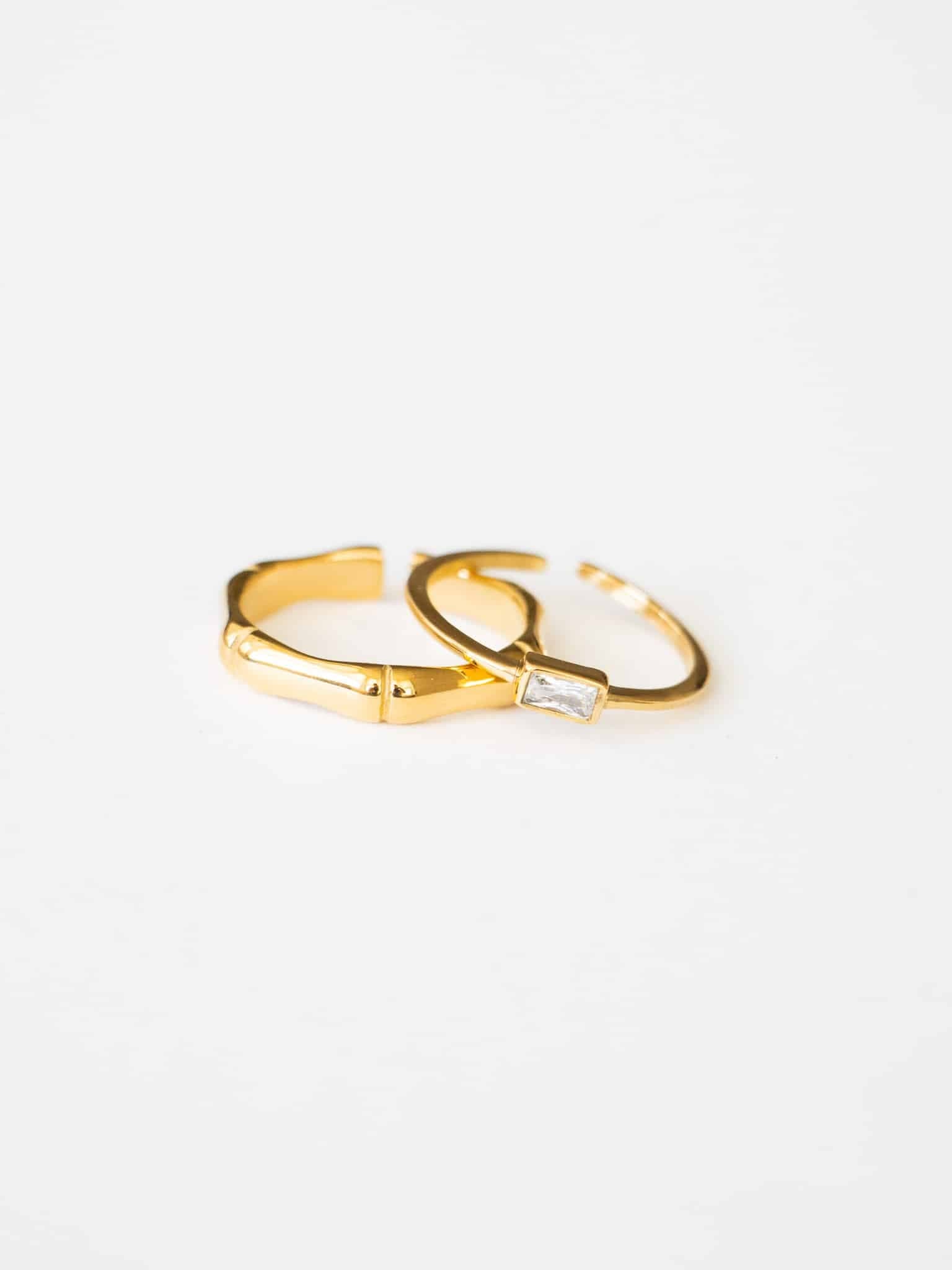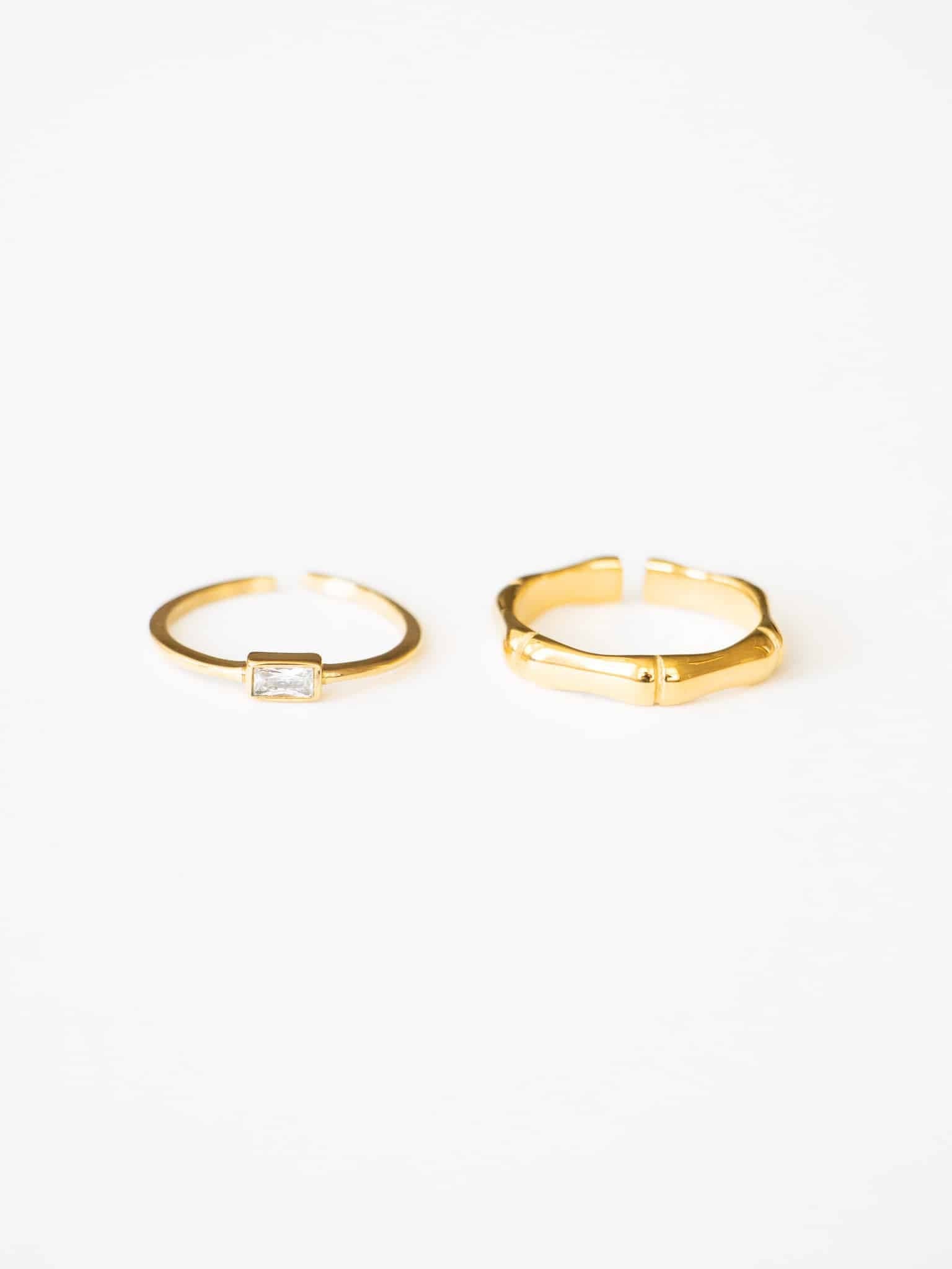 Wieso nur einen Ring tragen, wenn du gleich zwei Ringe im Doppelpack zum reduzierten Preis bekommst? Mit dem Ring Set, welches den schlichten Bamboo Ring und den eleganten Hannah Ring beinhaltet, lassen sich nun schlichte Alltags-Looks sowie aufregende Abend-Outfits perfekt in Einklang bringen. Verschönere also deine Hände mit dem trendigen Set oder mache deiner Freundin ein funkelndes Geschenk. Der Clou: Das komplette Set ist wasserfest! Die Ringe bestehen aus 18 Karat vergoldetem Edelstahl und auf die Vergoldung hast du 5 Jahre Garantie!