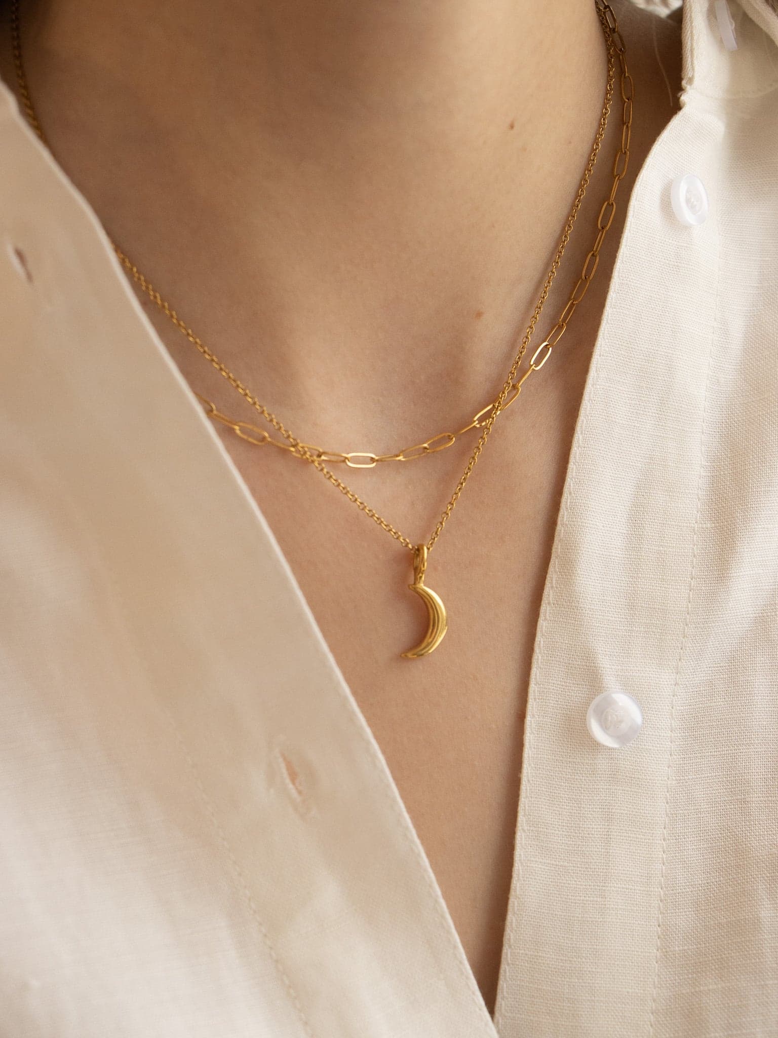 Entdecke die Schönheit des Himmels mit unserem Lil Brooklyn New Moon Necklace Set, bestehend aus zwei einzigartigen Schmuckstücken. Trage beide Ketten zusammen für einen trendigen Layering-Look oder einzeln, um deinem Outfit einen subtilen Akzent zu verleihen. Das Highlight dieses Sets ist die zweite Kette, die mit einem atemberaubenden Mond-Anhänger verziert ist. Der Mond-Anhänger fängt die Magie des Nachthimmels ein und symbolisiert die Geheimnisse des Universums. Das Halsketten Set ist wasserfest! Auf die Vergoldung der Ketten hast du übrigens 5 Jahre Garantie!