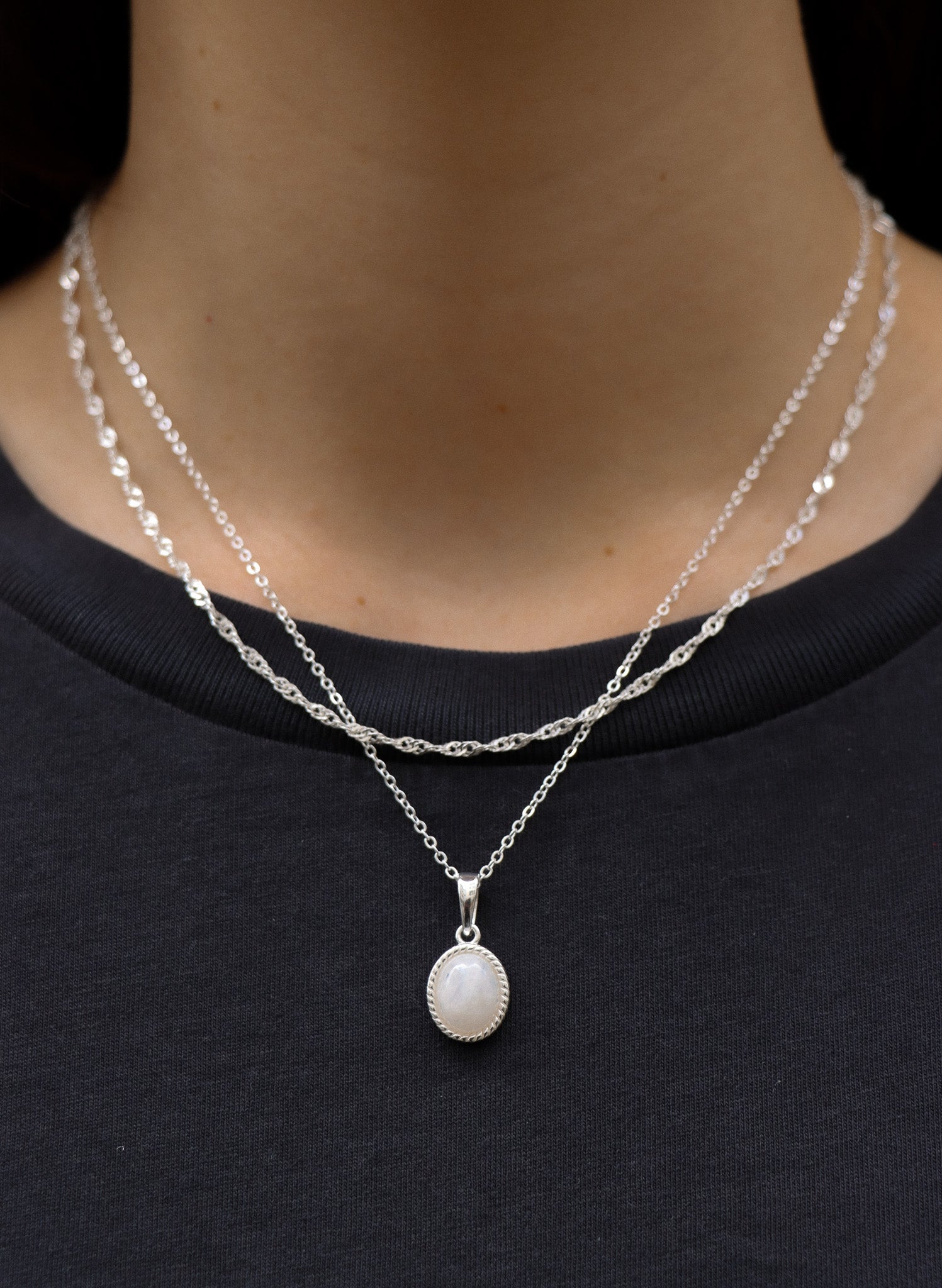 Der Mondstein der klassischen Noemi Kette wird von einer detaillierten Fassung umrandet. Diese Kette ist ein sehr elegantes Piece, das du in zwei Längen ideal zu einem kuscheligen Pullover oder einer eleganten Bluse kombinieren kannst.
