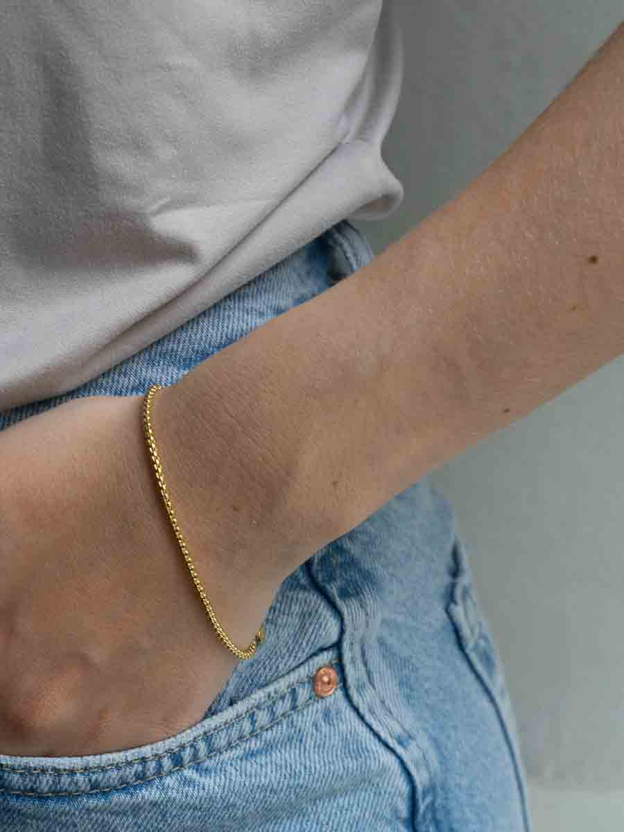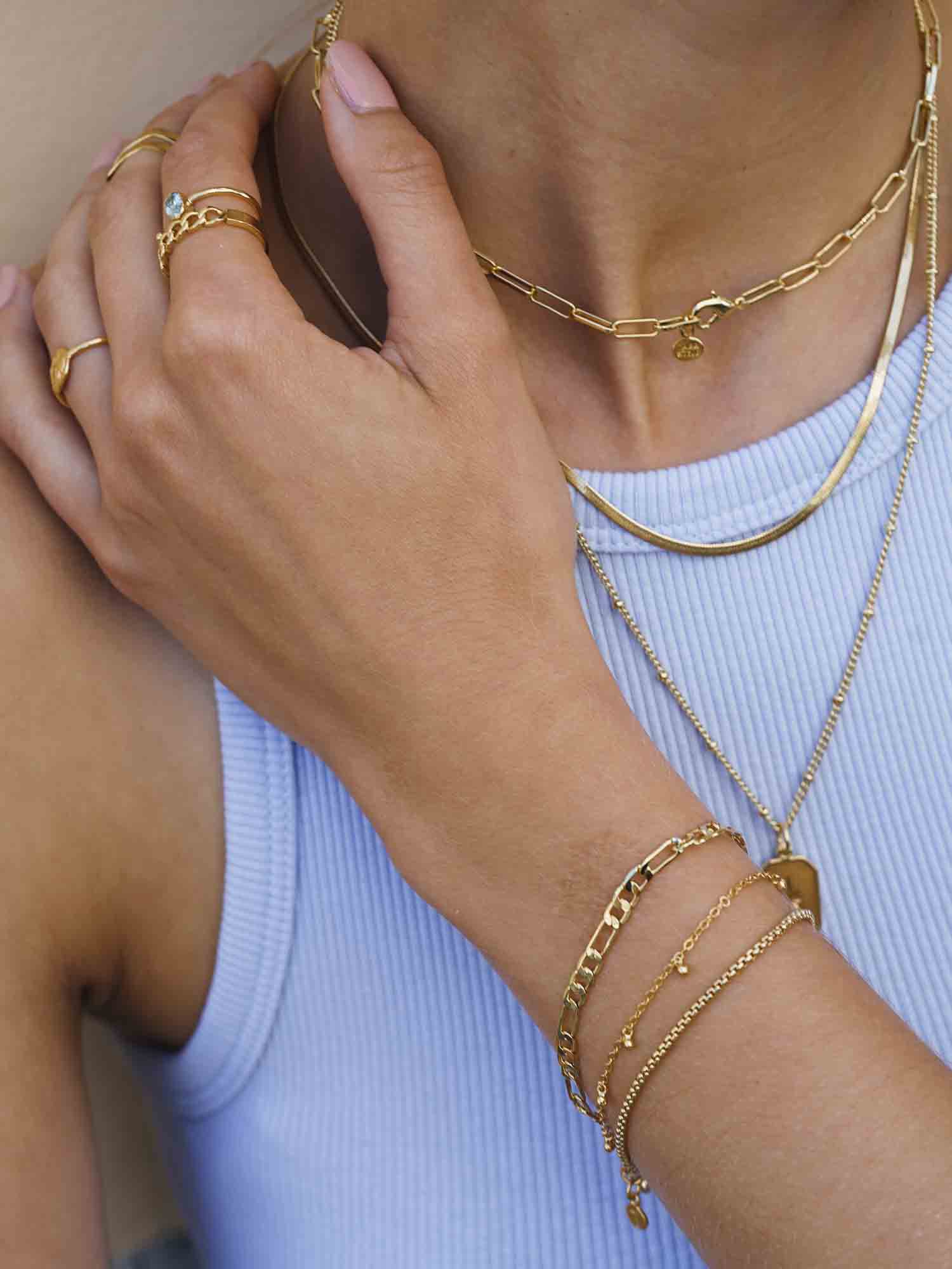 Schmücke dich mit unserem neuen Nora Bracelet und vervollständige deinen stilvollen Look mit dieser trendigen wasserfest vergoldeten Armkette. Du trägst lieber Silberschmuck? Dann entdecke jetzt das Nora Bracelet aus 925 recyceltem Sterling Silber.