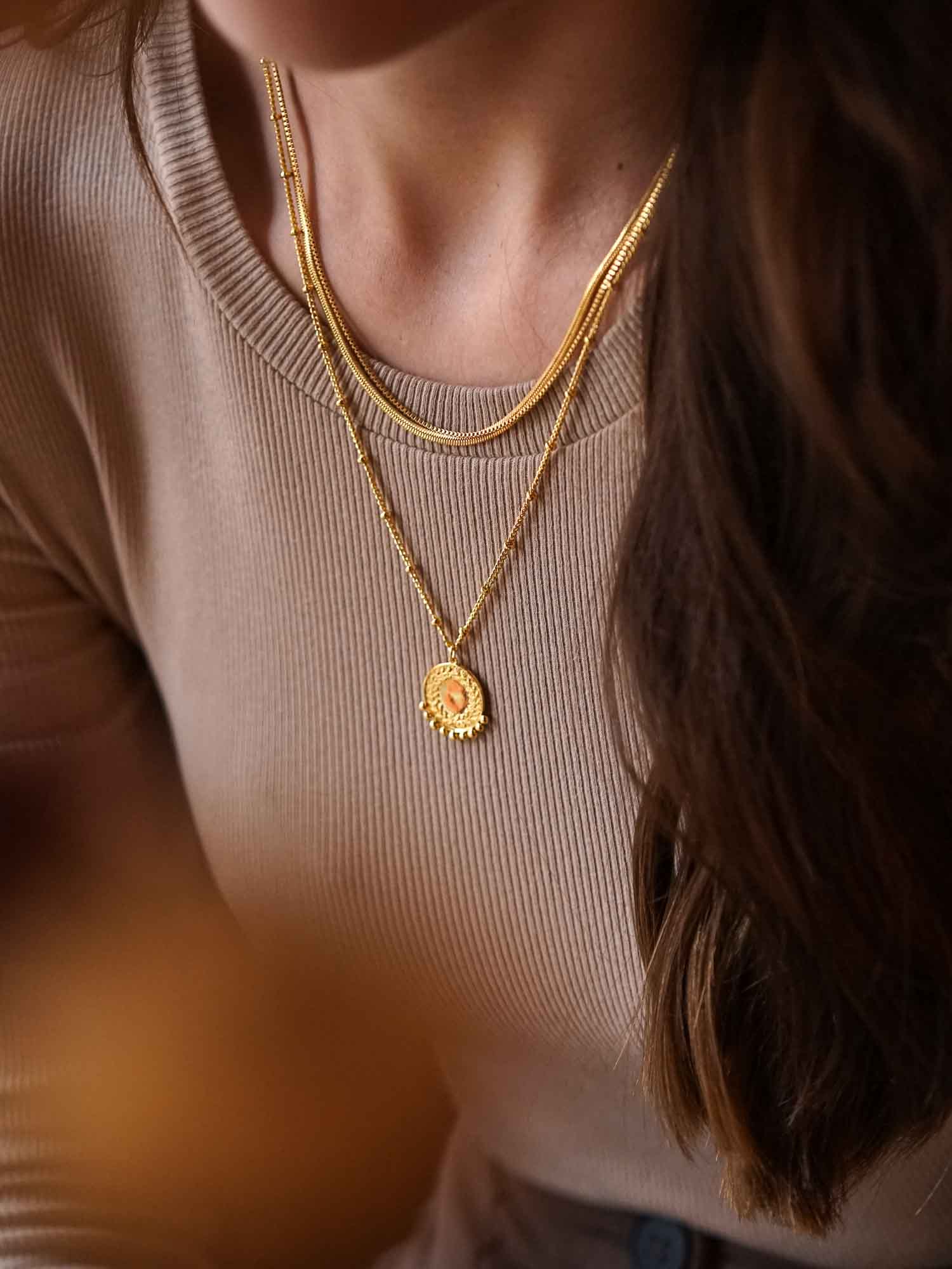 Die Rubia Double Chain Necklace zaubert dir einen harmonischen Layering Look ans Dekolleté. Die vergoldete Doppel-Halskette zieht alle Blicke auf sich. Dabei verbindet sie die beliebte Snake Chain mit einer filigranen Box Chain. Ausserdem besteht die Rubia Double Chain aus 18 Karat Stainless Steel und ist somit wasserfest. Du kannst sie also beim Baden, Duschen und beim Sport einfach anlassen.