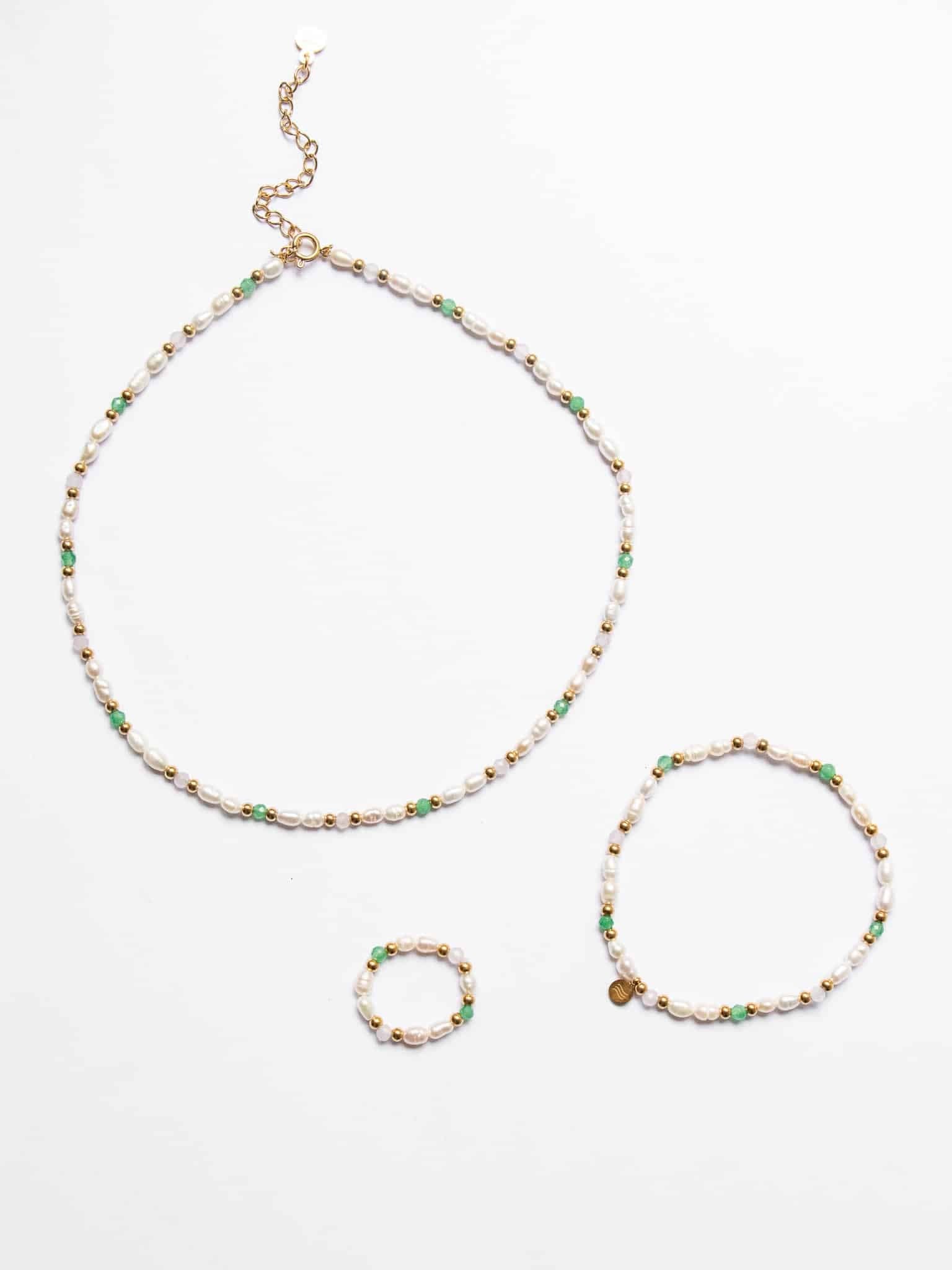 Das Santorini Set - Eleganz und Urlaubsgefühl vereint! Tauchen Sie ein in die Schönheit der griechischen Insel Santorini mit unserem exquisiten Schmuckset. Bestehend aus einem elastischen Ring, Armband und einer verstellbaren Kette, ist das Set aus Süsswasserperlen, Rosenquarzperlen, grünen Chalcedon Kügelchen und goldenen Akzenten gefertigt.