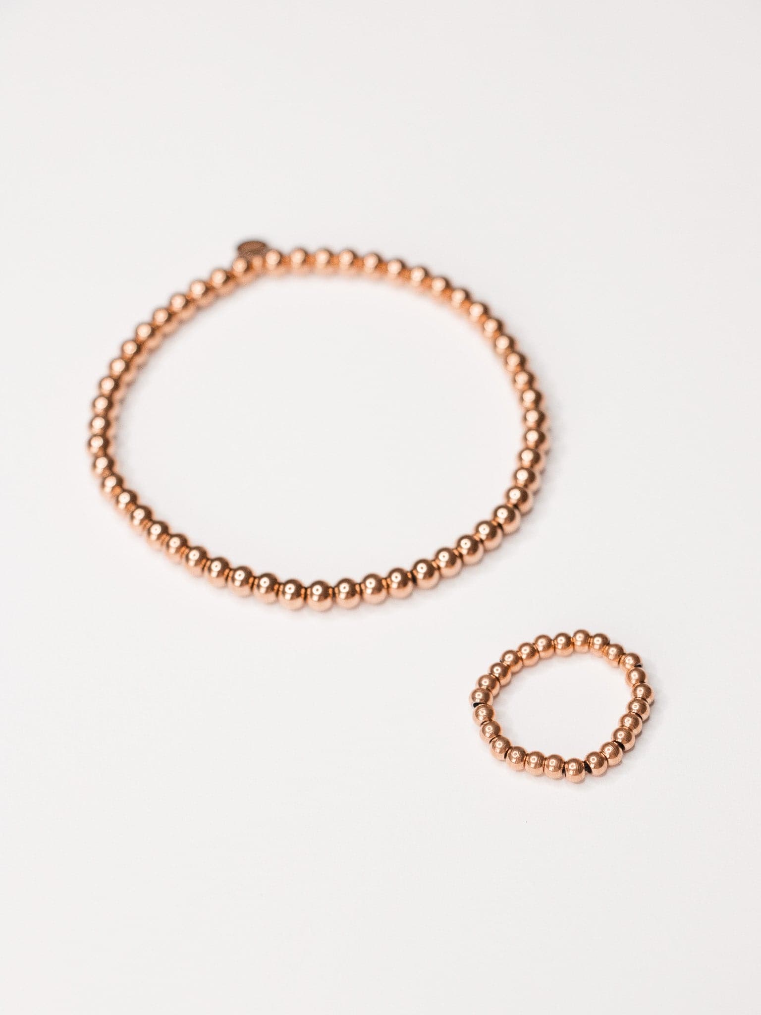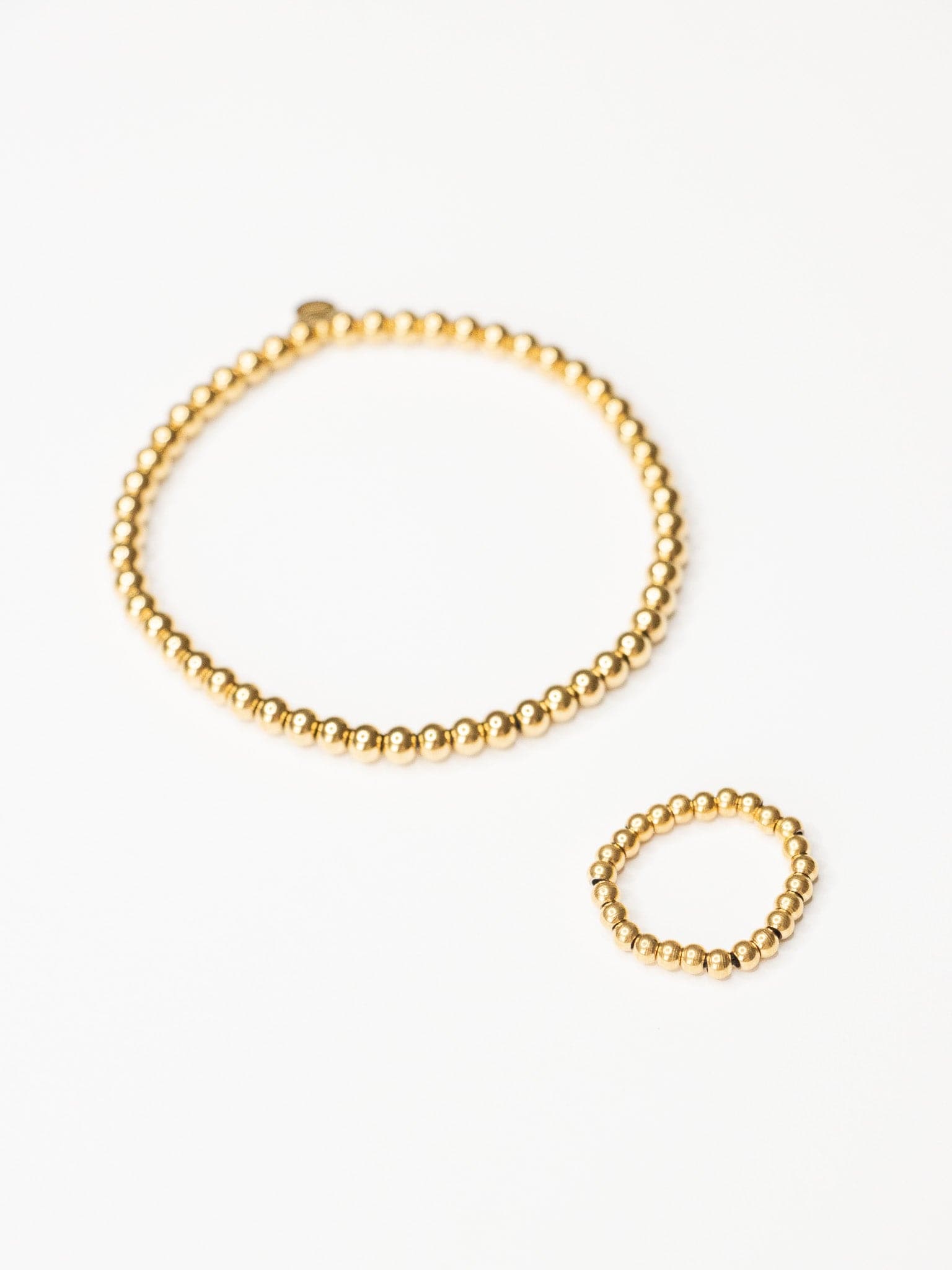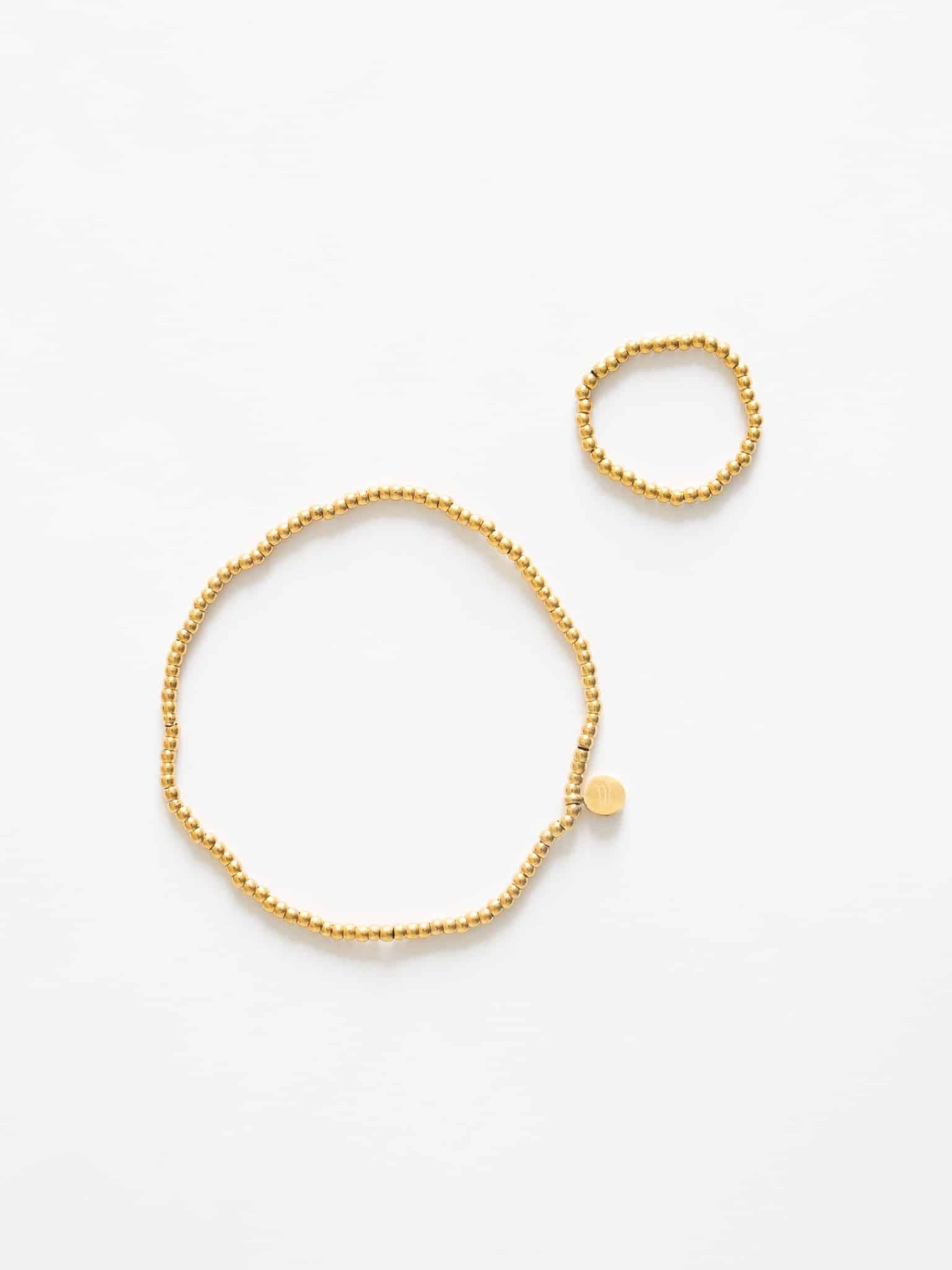 Das Sia Bracelet und Ring Set - Eleganz für jeden Tag! Beide Schmuckstücke sind elastisch und bestehen aus goldenen wasserfesten Kügelchen. Das Set bietet eine bequeme Passform und ist perfekt für den täglichen Gebrauch geeignet. Die goldenen Kügelchen verleihen deinem Outfit einen luxuriösen Touch und reflektieren das Licht auf wunderschöne Weise.