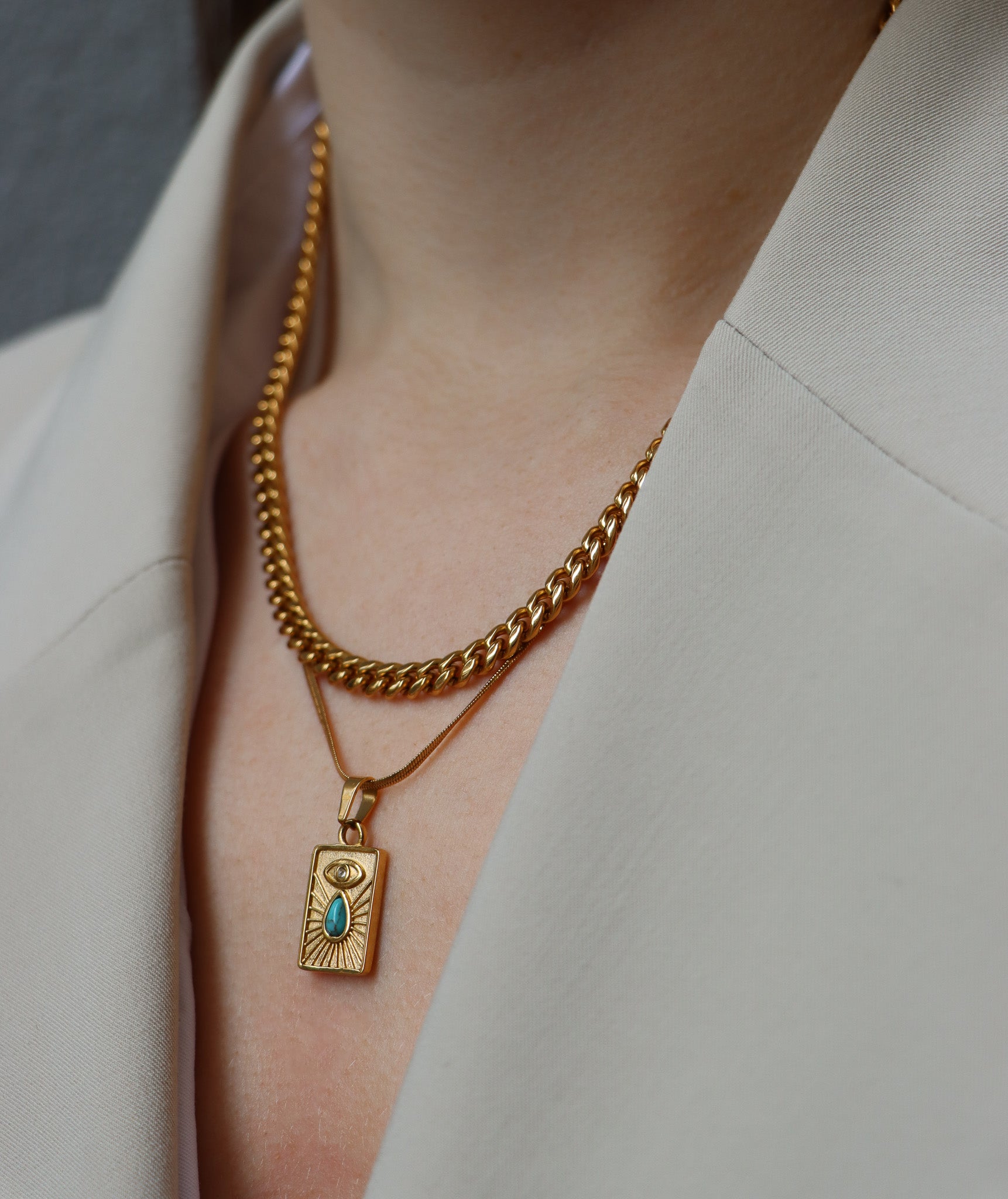 Diese markanten Schmuckstücke sind nicht nur trendig, sondern auch Symbole des Schutzes und der Offenheit. Die grobgliedrige Cuba Kette verleiht deinem Look einen einzigartigen Charme, während die Thalia Necklace feinste Handwerkskunst mit einer eleganten Schlangen-Optik und der Bedeutung von Türkis vereint – Schutz und Förderung der Offenheit.