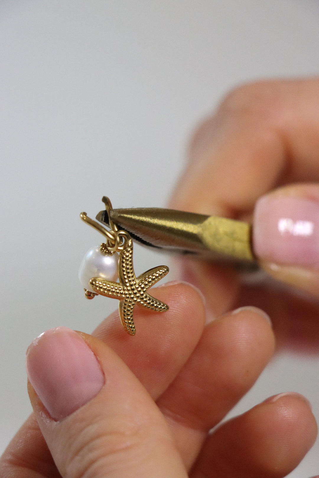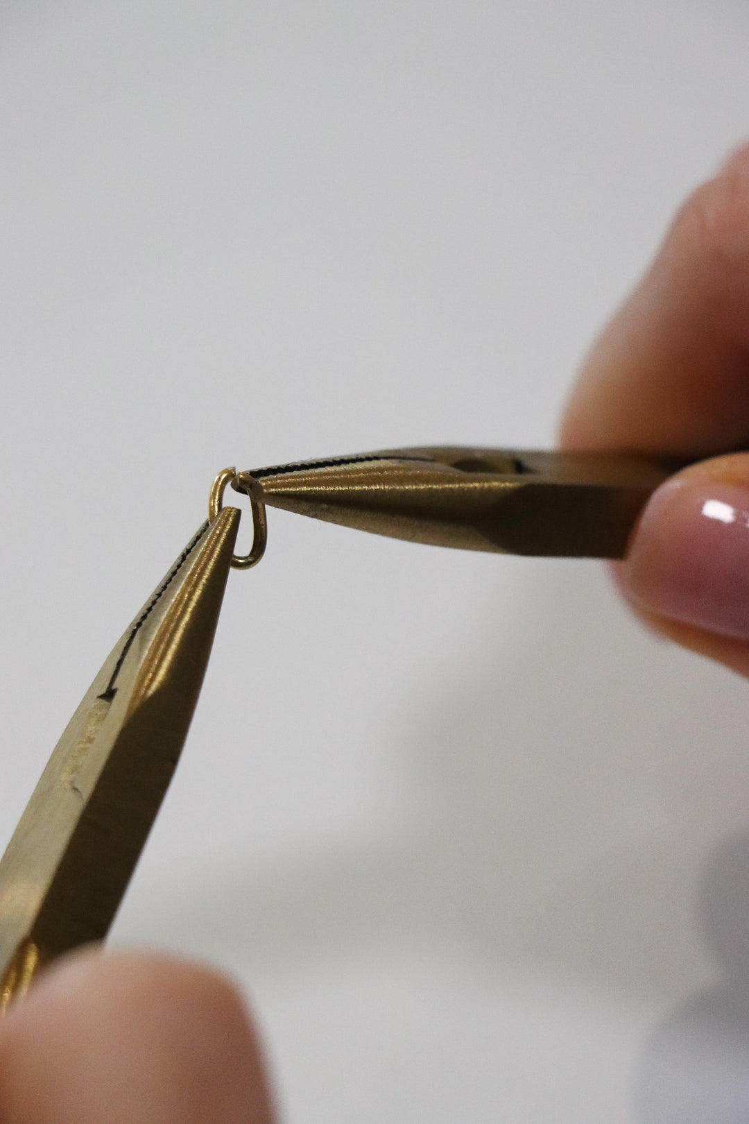 1. Charm Connector oder Öse mit ein wenig Druck öffnen. Wichtig: Eine Seite festhalten und die andere langsam in deine Richtung ziehen.